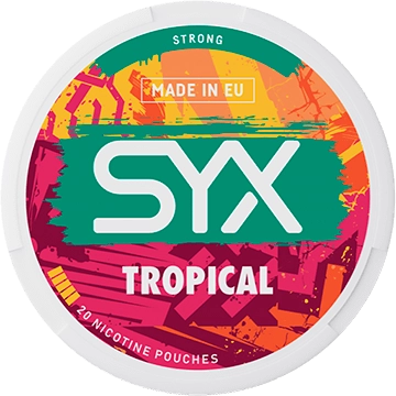 SYX Tropical Strong offers vibrant tropical flavor paired with steady nicotine strength in a discreet slim all-white pouch.